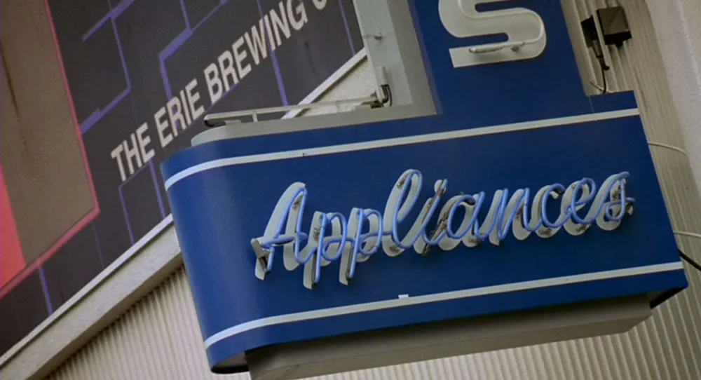 Somebody did their homework on this one (or spent a lot of time in vintage collectible shops). The Patterson’s appliance store looks like it belongs in the Smithsonian, it’s so accurate. I was only able to find one bit of type out of place: Early in the film, a billboard flashes across the screen briefly which has a few words set in Helvetica Bold.